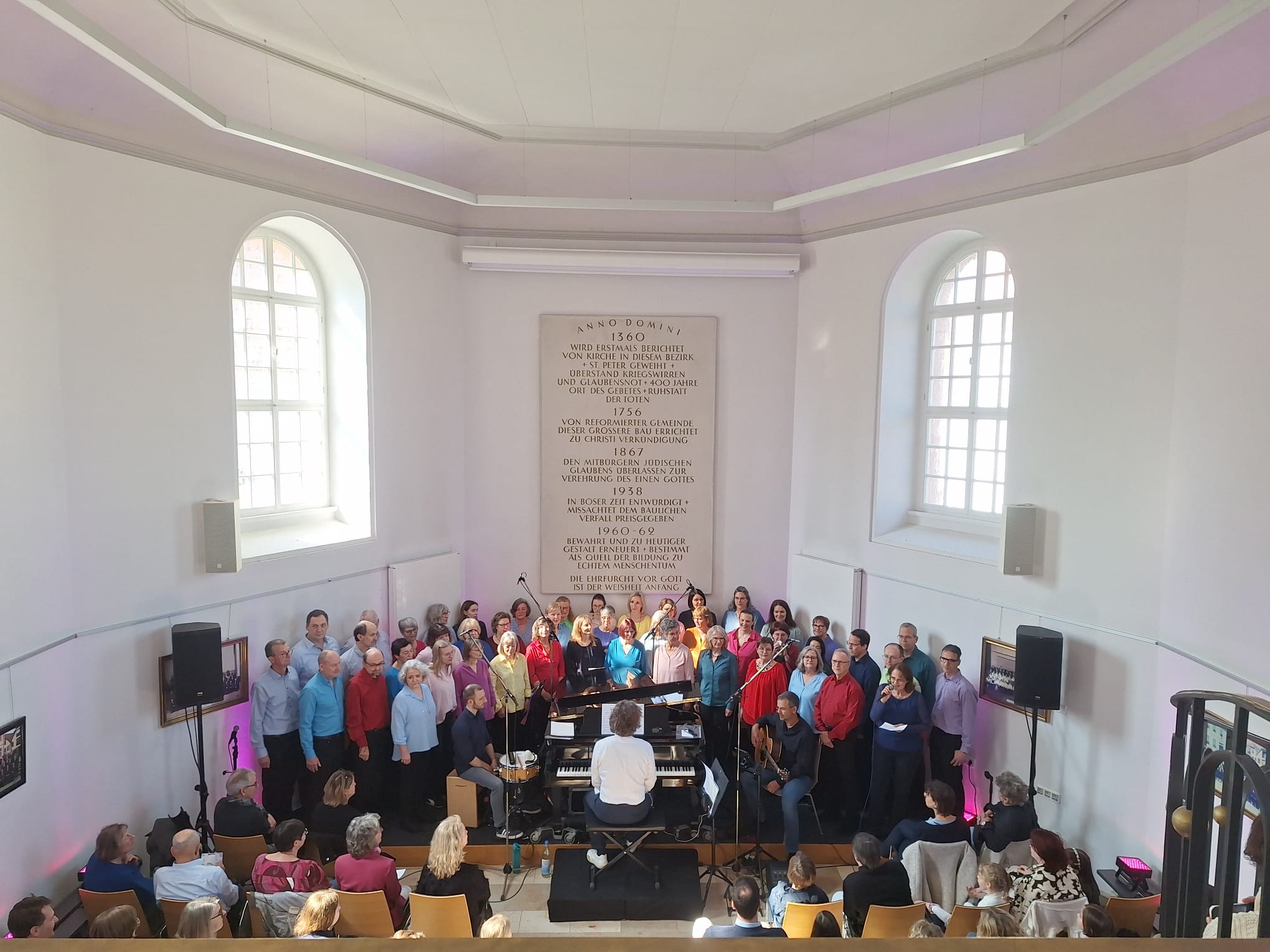 Samstagabend füllte sich nach einem kurzen Einsingen der kleine Saal rasch mit dem gespannten Publikum. Die erste Überraschung kam gleich bei der Begrüßung von Thomas, unserem Chorleiter. Auf seine Frage, wer denn schon ein Konzert des Chores in der ehemaligen Synagoge gehört hatte, meldete sich kaum jemand. Da waren also lauter Leute, die uns in dieser Location noch nicht gehört hatten. Noch mehr spannend!